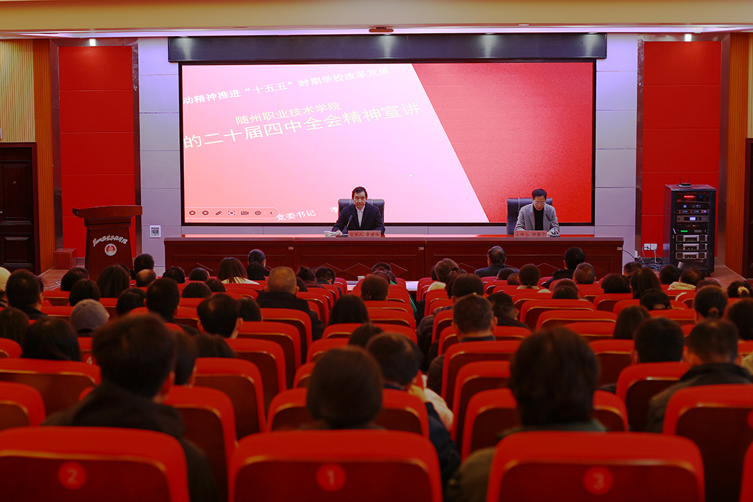 12月3日,我校党委理论学习中心组扩大学习党的二十届四中全会精神,党委书记李建伟作了题为《以历史主动精神推进“十五五”时期学校改革发展》的宣讲报告。会议要求全校上下以历史主动精神推进申本攻坚和新质随职建设,要求将学习成果转化为推动改革发展实际成效,为随州“单项工作走前列,整体工作争进位”、为中国式现代化贡献更多随职智慧和力量。校党委委员、副校长邹厚亏,党委委员、纪委书记、监察专员魏丹,工会主席张凤成,全校教研室主任以上干部和党员参加学习。