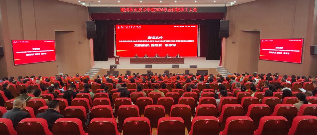 会上,梁学军宣读《中共随州职业技术学院委员会关于2025年度目标任务考核情况的通报》;校领导为获得2025年年度目标任务考核的6个优胜单位进行颁奖;曾庆东代表学校与资产管理中心、服装与艺术设计学院现场签订2026年度目标任务考核责任书。