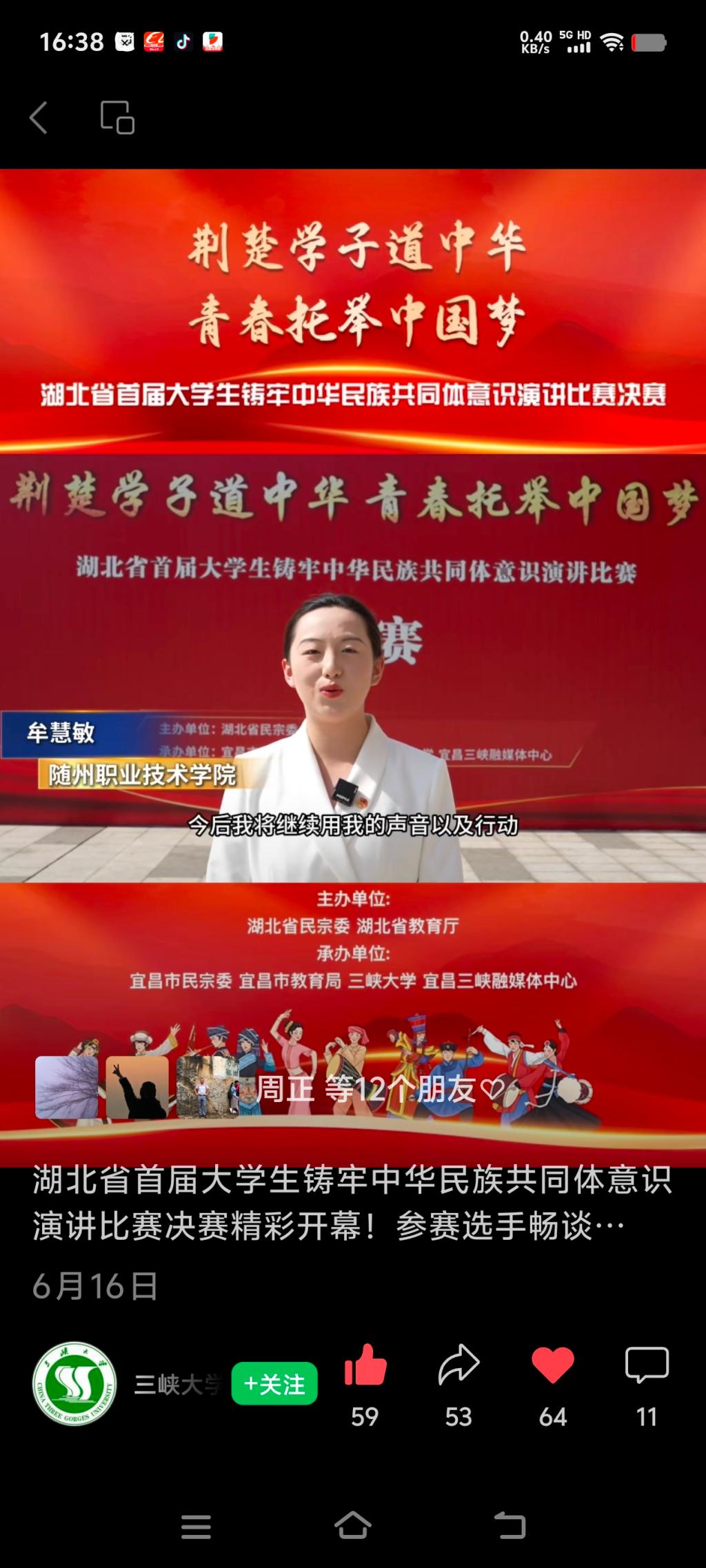 2025年6月16日,由湖北省民宗委、教育厅主办的湖北省首届“荆楚学子道中华 青春托举中国梦”大学生铸牢中华民族共同体意识演讲大赛决赛圆满落幕。我校党委统战部选派的旅游与经济管理学院2023级移动商务班牟慧敏同学凭借出色表现,勇夺高职组一等奖。同时,我校荣获大赛“优秀组织单位”集体荣誉。