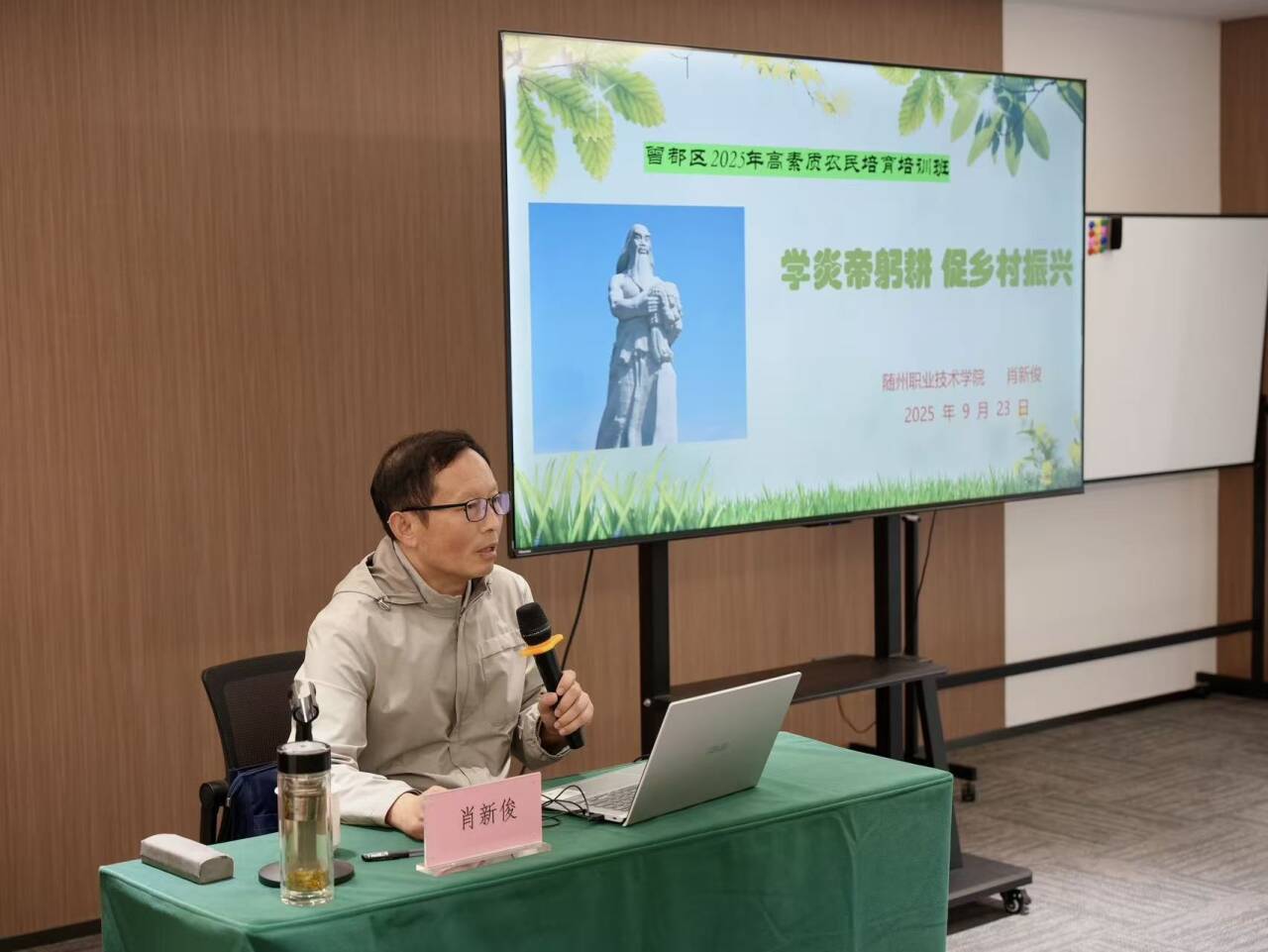9月23日,校党委宣传(统战)部部长、随州市文化传承研究中心研究员肖新俊教授赴洛阳镇,为湖北省农业广播电视学校曾都区分校举办的曾都区2025年高素质农民培育培训班作专题授课。